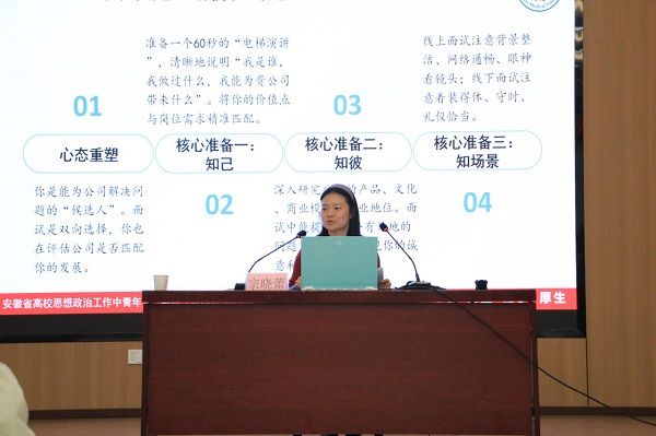 为加强校校合作,助力学生科学规划职业发展,提升毕业生求职竞争力4月8日下午,公共卫生学院宗晓蕾老师受邀到淮北理工学院,开展以“谋定而后动 突围方有成——大学生职业规划与实战能力提升”为主题的就业指导专题讲座。淮北理工学院相关负责人、毕业班辅导员及两百余名毕业生到会参加学习交流